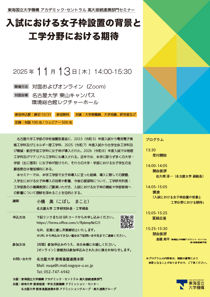 東海国立大学機構 アカデミック・セントラル 高大接続連携部門セミナー 「 入試における女子枠設置の背景と工学分野における期待」